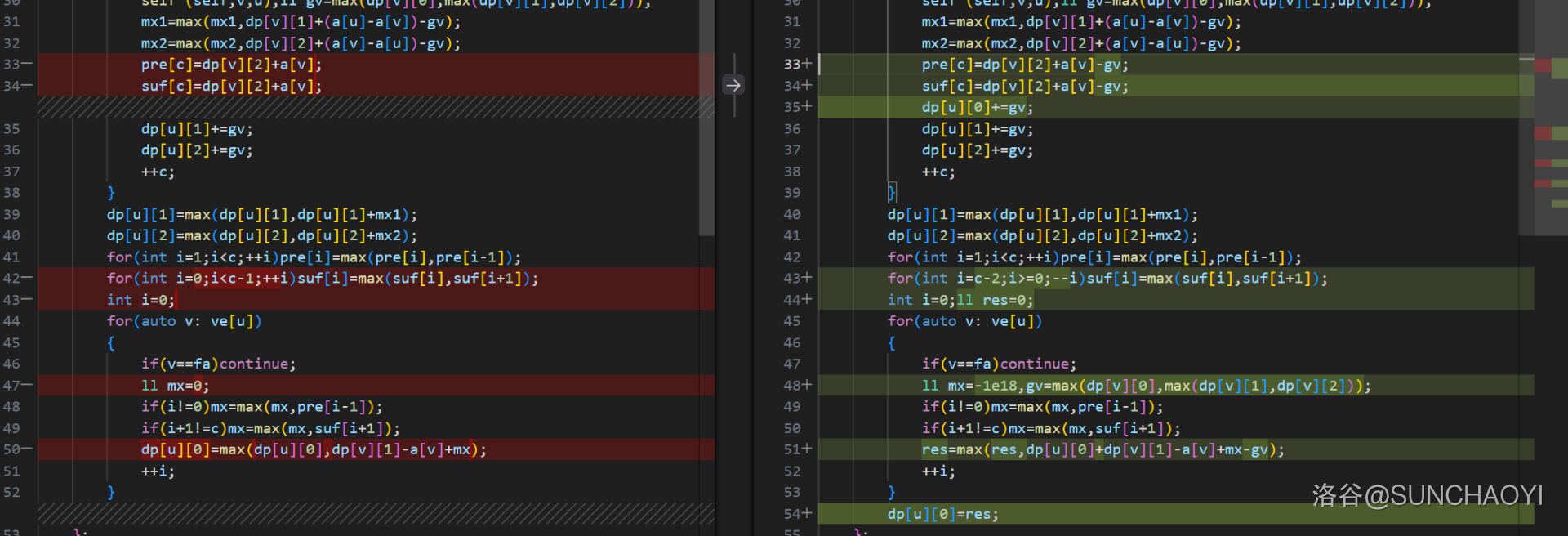 第二种情况非常恶心,反正各推了一个有八项的式子,兜兜转转能够分别写成 $t^{(1)}_{l-1}-t^{(1)}_{l-x},t^{(2)}_{l+x}-t^{(2)}_{l-1}$ 的形式,$t$ 同样是用左端点存区间答案的形式,然后最终 ST 表查某个区间的 $\max$。需要注意 $x$ 的值域以及 $t^{(1)}$ 和 $t^{(2)}$ 会有些许不同。