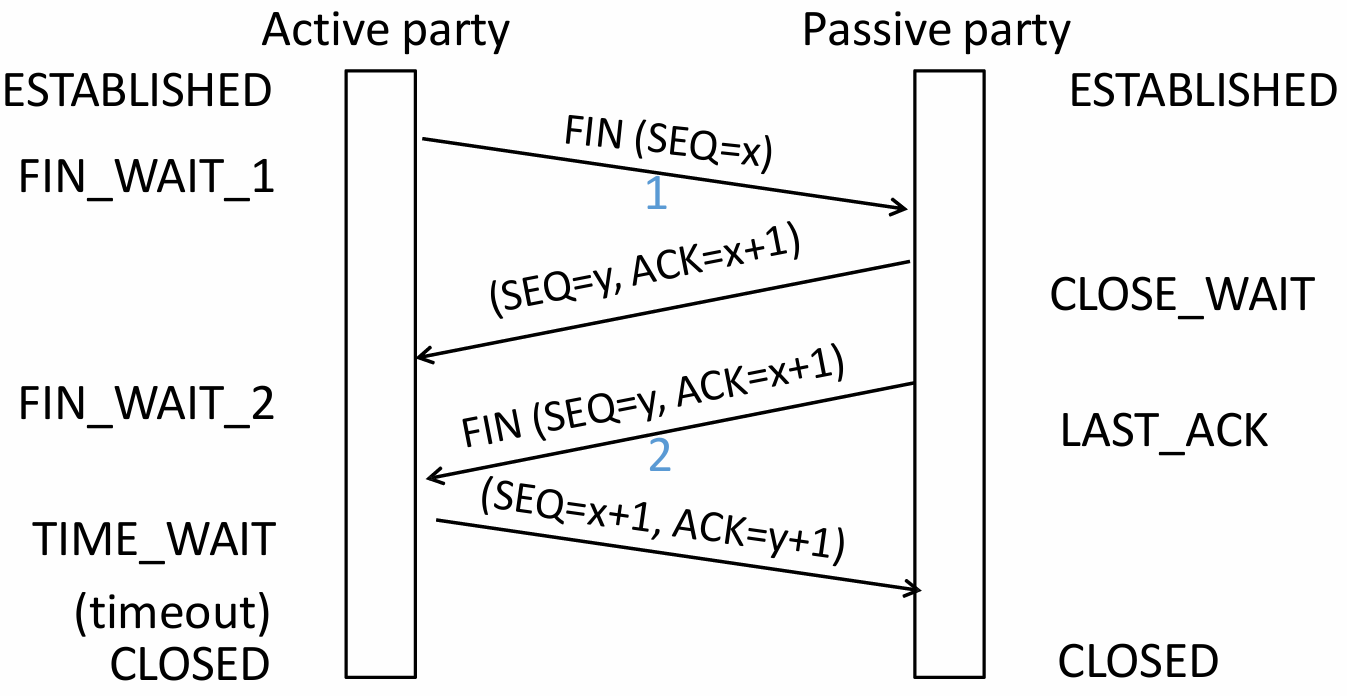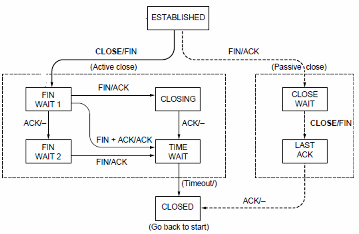 ESTABLISHED → close() → FIN_WAIT_1 → Receive ACK → FIN_WAIT_2 → Receive FIN → TIME_WAIT → Timeout → CLOSED -