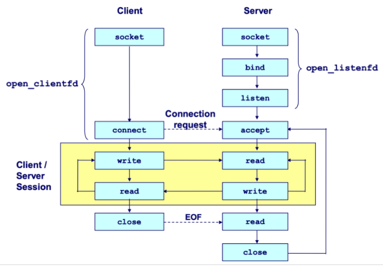 int accpet (int listenfd, sockaddr *addr, int *addrlen);accept()blocks until a client connects vialistenfd, stores the client's address inaddr, and returns aconnfdfor communication using standard Unix I/O functions. -